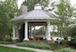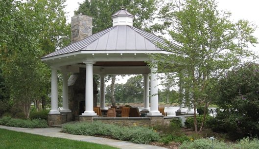 This generously scaled outdoor entertainment spot features a dramatic stone fireplace and raised hearth with built-in seating and panoramic views of the surrounding gardens and picturesque shoreline. The Tuscan style columns, custom stonework and standing seam metal roof reference several distinctive architectural features seen in the early 20th century neo-classical residence nearby. Herb-lined pathways trail through a new landscape design complementing the traditional setting and creating a gracious connection between the indoor and outdoor living spaces on this country estate.